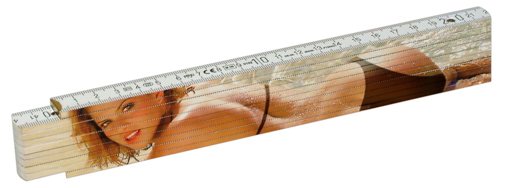 Muss man(n) einfach haben! 2-Meter-Zollstock aus lackiertem Holz. Vollflächig 2-seitig mit erotischem Girl-Farbmotiv bedruckt. In Klarsichtverpackung mit Aufhängevorrichtung.
